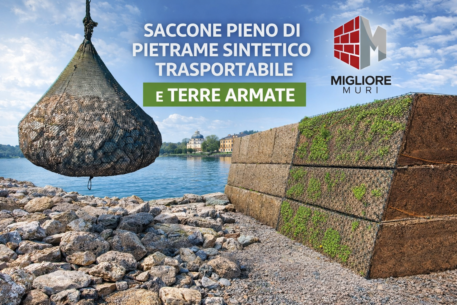 Sacconi sintetici riempiti di pietra per fondali marini, argini e opere idrauliche. Soluzioni efficaci per la difesa del territorio.